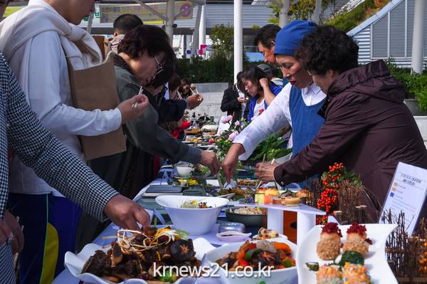 △지난해 제1회 전국 여수 수산물 음식경연대회 출품 음식을 시민과 관광객들이 맛보고 있다.