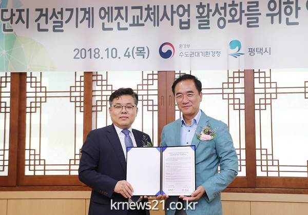 평택시(시장 정장선)는 4일 수도권대기환경청(청장 김동구)과 시청 대외협력 실에서 ‘산업단지 내 건설기계 노후엔진 교체사업 활성화를 위한 업무협약’을 체결했다.