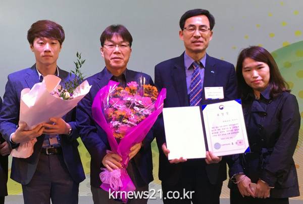 △지난 12일 정재호 여수시 지역경제과장(왼쪽 셋째)이 군산에서 열린 전국우수시장박람회에 참석해 전통시장 활성화 공로 지자체에 수여되는 중소벤처기업부장관상을 받고 있다.