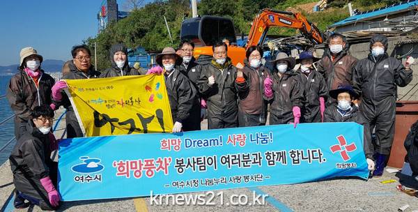 △여수시 공무원으로 구성된 희망풍차 봉사팀(사진)은 지난 13일 ‘저장강박증’으로 집안에 수십 톤의 쓰레기를 쌓아 논 월호동의 홀몸노인 주택에서 쓰레기를 수거하고 소독·청소하는 봉사활동을 했다.