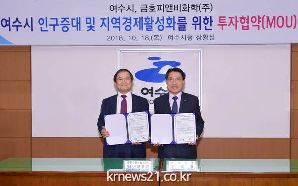 시에 따르면 18일 오후 시청 상황실에서 권오봉 여수시장과 문동준 금호피앤비화학㈜ 대표이사가 이 같은 내용의 투자협약서에 서명했다.