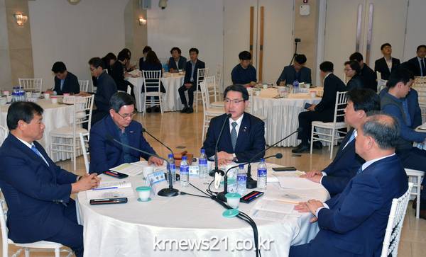 △19일 오후 여수 마띠유호텔에서 열린 국가산단 지방정부협의회에서 신임 회장으로 선출된 권오봉 여수시장(앞 테이블 왼쪽 셋째)이 발언하고 있다.