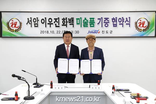 진도군은 지난 22일 군청 상황실에서 이동진 군수와 서암 이우진 화백 등이 참석한 가운데 이우진 화백의 미술품 기증 협약식을 체결했다.