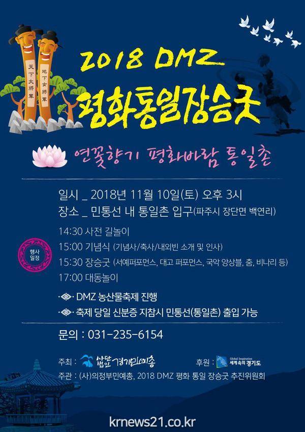 “2018 DMZ 평화 통일 장승굿”(이하 “장승굿”)은 사단법인 경기민예총(이사장 이성호)이 주최하고 경기도에서 후원하는 사업으로 작년에 이어 두 해째 이어지고 있다.