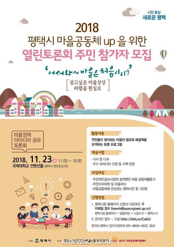 평택시(시장 정장선)는 다음달 23일 평택시 국제대학교 컨벤션홀에서 ‘어서와~ 마을은 처음이지?’를 부제로 ‘2018 평택시 마을공동체 열린 토론회’를 개최한다.