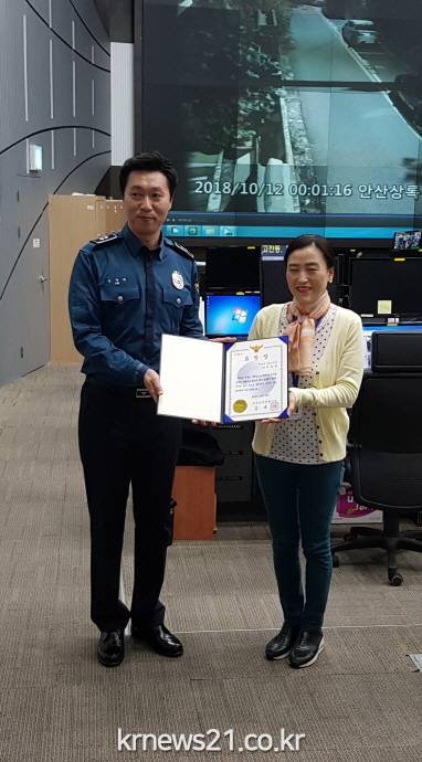 지난달 새벽 모니터 요원 이 모씨는 상록구 본오동 745번지 앞 노상에 주차된 차량 안으로 들어가 금품을 훔치는 피의자 2명을 발견, 경찰에 신고하고 도주하는 용의자들을 CCTV로 추적‧통보해 용의자 검거에 결정적으로 기여했다.