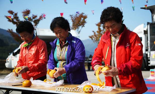 이 날 행사는 링 던지기, 제기차기, 낚시게임 등 마을운동회를 시작으로 감 빨리깎기, 감 씨앗