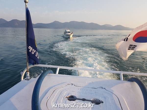 여수 해상에서 선상 낚시 중 원인 미상의 기관고장을 일으킨 레저보트를 해경이 구조ㆍ예인에