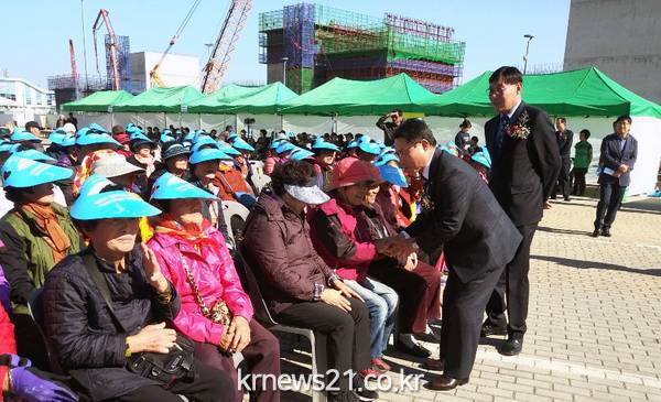 (△권오봉 여수시장이 지난 2일 여수세계박람회장 내 스카이타워 광장에서 열린 만덕동 합동 경로 위안잔치에서 어르신들에게 인사를 하고 있다.)