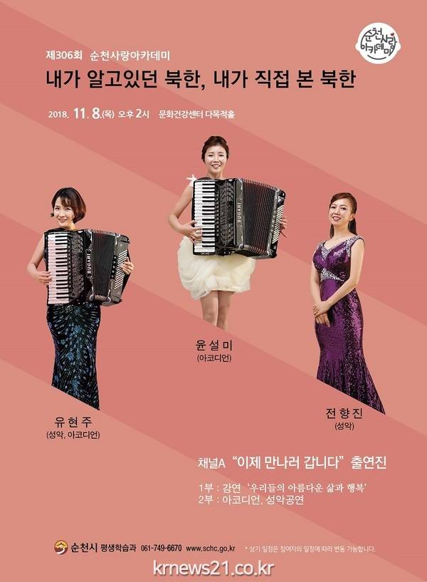 아울러 306회 순천사랑아카데미에서는 유현주 강사와 함께 북한 금성학원에서 아코디언을 전공한 윤설미씨, 함경북도 예술단 성악배우와 1호 행사 등을 공연했던 전향진씨의 아름다운 공연도 이어진다.