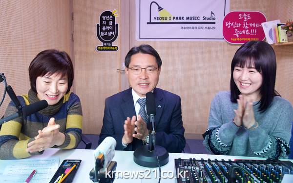 여수시에 따르면 권오봉 시장은 9일 오전 10시 시청 1층 음악방송 스튜디오에서 진행된 여수아이파크뮤직 녹음에 참여했다.