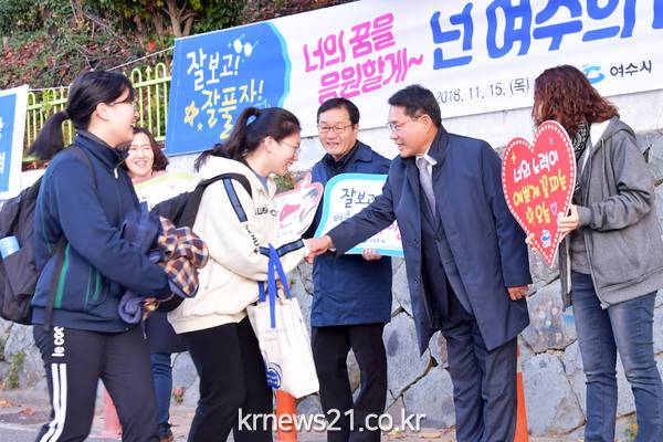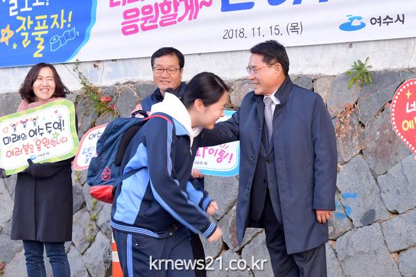 △권오봉 여수시장(오른쪽 둘째)이 대학수학능력시험일인 15일 오전 여수여자고등학교로