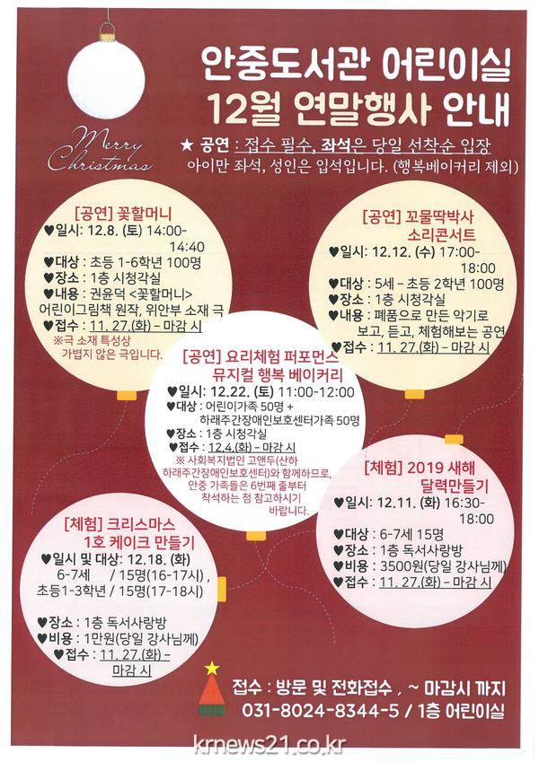 12월 문화행사는 전화 및 방문을 통해 신청 가능하며, 프로그램에 관한 자세한 내용은 안중도서관 홈페이지(www.ptlib.go.kr/ajlib) 공지사항을 확인하거나 전화(031-8024-8344~5)로 문의하면 된다.