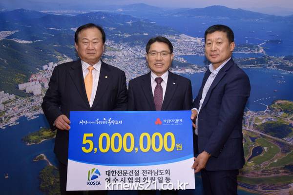 시에 따르면 지난 14일 오종순 대한전문건설협회 전라남도회장과 이동근 여수시협의회장이 시청을 방문해 권오봉 여수시장에게 성금을 전달했다.
