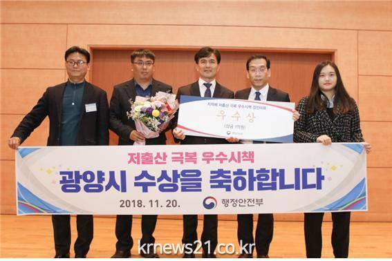 광양시는 11월 20일 서울 정부청사에서 ‘전국 지자체 저출산 극복 우수시책 경진대회’ 에서 『청년 주택자금 대출이자 지원 사업』이 국무총리상으로 선정됐다고 밝혔다.