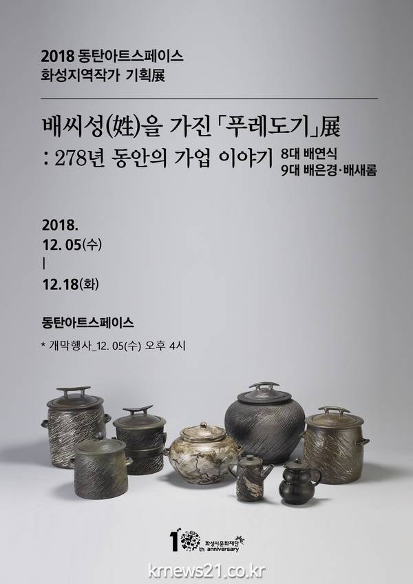 (재)화성시문화재단 동탄복합문화센터 동탄아트스페이스에서는 2018년 12월 5(수)부터 12월 18일(화)까지 2018 동탄아트스페이스 화성지역작가 기획展 <</span>배씨성(姓)을 가진 푸레도기展 :278년 동안의 가업 이야기>를 개최한다.