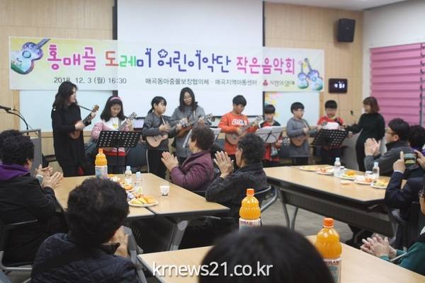순천시 매곡동은 지난 3일 탐매희망센터에서 소외계층 어르신들을 모시고 ‘홍매골 도레미 어린이 악단’이 연주하는 찾아가는 작은 음악회를 가졌다고 밝혔다.