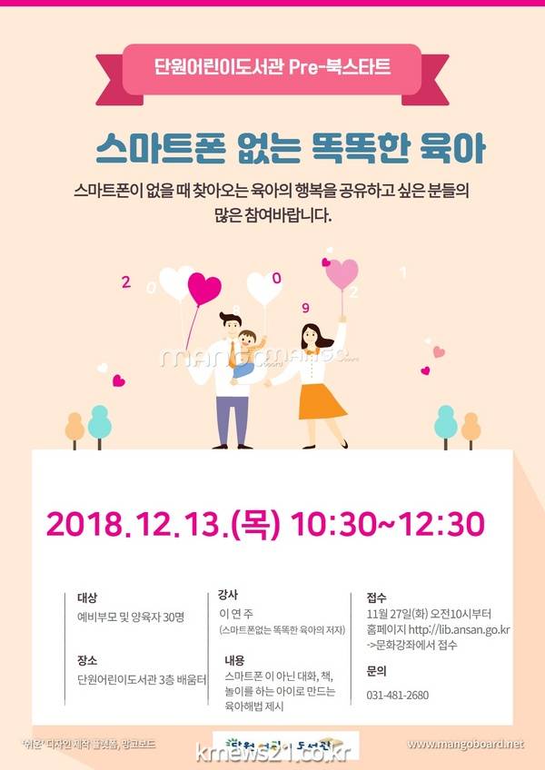 안산시 단원어린이도서관은 오는 13일 오전 10시 30분 Pre-북스타트 사업의 일환으로 육아 특강 ‘스마트폰 없는 똑똑한 육아’를 진행한다.