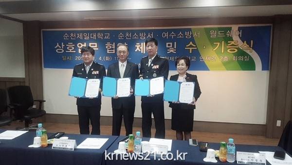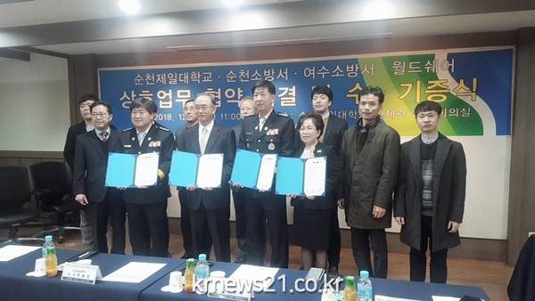 □ 여수소방서(서장 김용호)는 12. 4일 순천제일대학교에서 순천제일 대학교, 월드쉐어 등과 주택용 소방시설 보급 활성화 등을 위한 업무협약을 체결했다고 밝혔다.