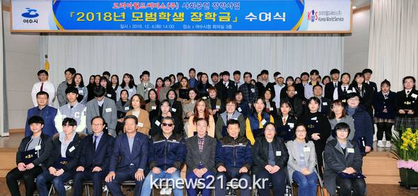 여수시(시장 권오봉)는 코리아월드써비스㈜가 지역 고등학생과 대학생에게 장학금 5000만 원을 지급했다고 밝혔다.