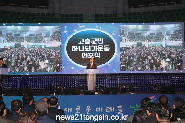 고흥군(군수 송귀근)은 12월 11일 오후 2시, 팔영체육관에서 송귀근 군수, 송우섭 군의장, 황주홍 국회의원을 비롯한 각급 기관사회단체와 각계각층의 군민 3,000여명이 참석한 가운데 ‘군민 하나 되기 운동 선포식’을 성황리에 개최했다고 밝혔다.