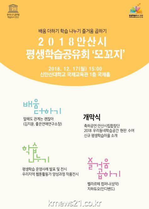 안산시(시장 윤화섭)는 오는 17일 신안산대학교 국제교육관 1층 국제홀에서 ‘2018 안산시 평생학습공유회 모꼬지’행사를 개최한다.