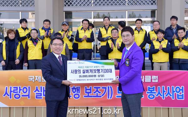 여수시(시장 권오봉)는 국제로타리 3610지구 여수 중앙로타리클럽이 거동이 불편한 어르신들을 위해 600만 원 상당의 성인용 보행기를 기탁했다고 밝혔다.