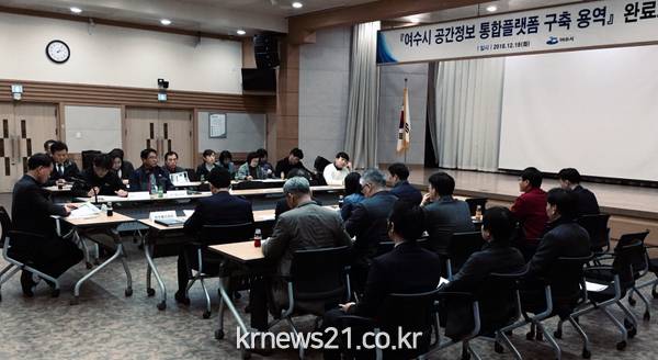 △지난 18일 여수시청 회의실에서 여수시 공간정보 통합플랫폼 구축 용역 완료보고회가 열리고 있다.