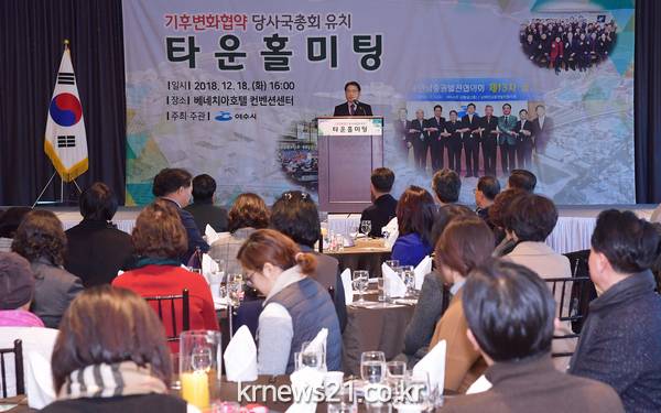 (△지난 18일 권오봉 여수시장이 베네치아호텔 컨벤션센터에서 열린 기후변화협약 당사국총회 유치 타운홀미팅에서 COP유치 의지를 밝히고 있다.)