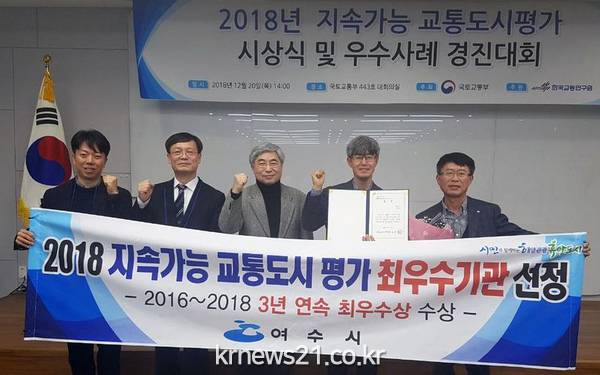 여수시(시장 권오봉)가 국토교통부의 2018년도 지속가능 교통도시 평가에서 최우수 도시에 선정돼 특별교부세 5000만 원을 받았다.