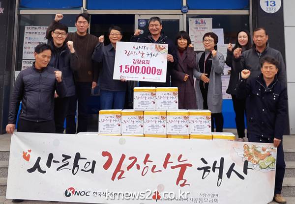 한국석유공사 여수지사도 20일 김치 나눔에 동참했다. 한국석유공사는 이날 직원들이 구내식당에서 직접 담근 김치(10㎏) 21상자를 주민센터에 후원했다.