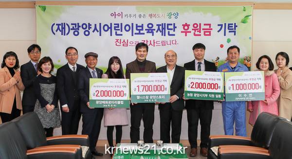 광양시는 지난 24일 시 접견실에서 정현복 광양시장, 강용재 보육재단 상임이사, 기탁자 등 15여 명이 참석한 가운데 후원금 기탁식이 열렸다고 밝혔다.