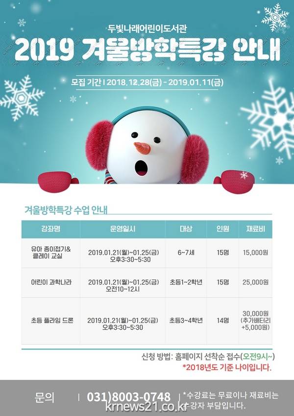 겨울방학 특강은 관내 15개 관에서 운영되며, 도서관마다 색다른 프로그램들을 진행한다. 미취학 아동을 대상으로 하는 독서연계강좌로 신나는 그림책놀이터(진안도서관), 꼼지락 책 놀이(병점도서관), 1월에 만나는 동화작가(동탄 복합 문화센터도서관), 그림책 상상 놀이터(봉담 도서관) 등을 운영하며, 초등학생을 위한 동화와 함께하는 신기한 마술놀이(남양도서관), 뚝딱뚝딱 어린이 목공방(송산도서관), 나만의 컬러테라피(동탄 중앙 이음터 도서관), 알아두면 쓸 데 있는 역사 속 인물(병점도서관) 등 총 24개의 다양한 강좌가 마련되었다.