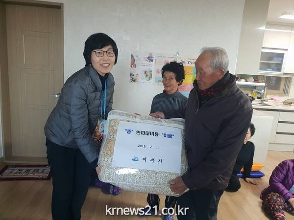 여수시(시장 권오봉)는 지난 1일부터 3일까지 독거노인, 조손가정 등 의료취약소외계층 40가구에 이불 240만 원 상당을 전달했다고 밝혔다.