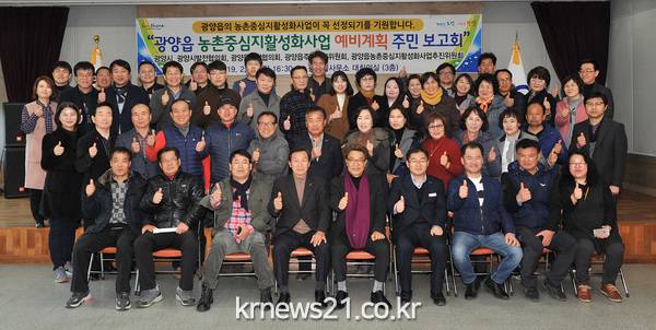 정홍기 광양읍장은 “예비계획서 제출 및 심사의 과정을 충실히 준비해 농촌중심지활성화사업에 최종 선정될 수 있도록 노력하겠다.”며, “주민의 삶의 질 향상과 일자리 창출을 통해 삶과 문화가 어우러지는 행복1번지 광양읍을 만들어나가겠다.”라고 말했다.