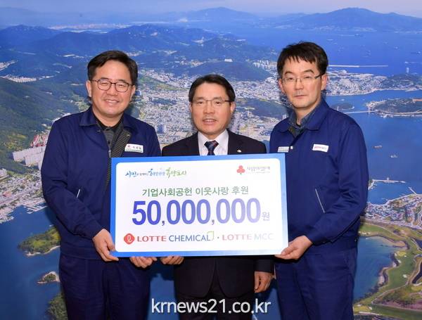 ㈜롯데케미칼과 롯데MCC가 지난 12일 관내 저소득층과 복지 위기가구를 위해 써달 라며 여수시에 후원금 5000만 원을 전달했다.