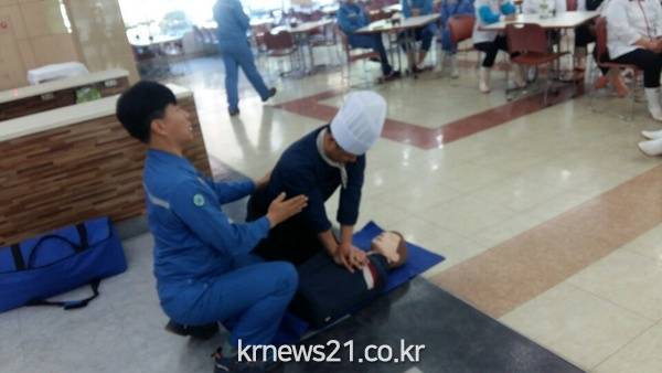 쿵소리가 나서 모두 쳐다만 보고 있을 때,바로 달려들어 흉부압박을 빠르고 강하게,충분히 이완시키고 중단하지 않고 계속 자신감있게 실시한 결과 소중한 한 생명을 살리게 되었다고 말하며,작년12월 대식당 에서 받은 현장 중심의 사례교육이 많은 도움이 되었다고소감을 밝혔다.