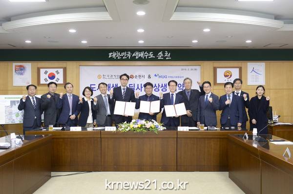 순천시(시장 허석)는 2월 26일 순천시청에서 한국감정원 (원장 김학규), 주택도시보증공사(사장 이재광)와 함께 국토부 도시재생 뉴딜사업의 성공적 추진과 지방소멸에 대비한 압축도시 시범모델 구축을 위한 상생협력 업무협약을 체결했다고 밝혔다.
