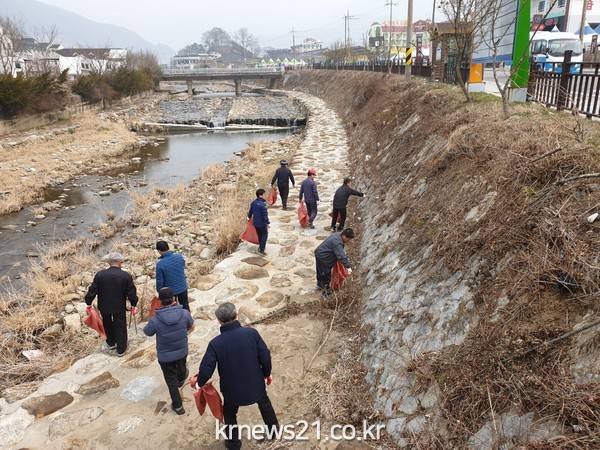 온천지구내 하천에 버려져 있는 쓰레기, 폐비닐 등을 수거하는 환경정화 활동을 전개했