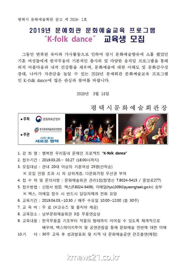 지원받은 국비로 진행되는 첫 번째 프로그램은 ‘행복한 우리 동네 문예인 프로젝트 K-folk dance’ 교육으로 그동안 반복된 육아와 가사활동으로 문화예술향유에 소홀한 기혼 여성들에게 한국무용의 기본적인 춤사위와 다양한 움직임을 통해 한국무용의 아름다움과 건강함을 선물하고자 한다.