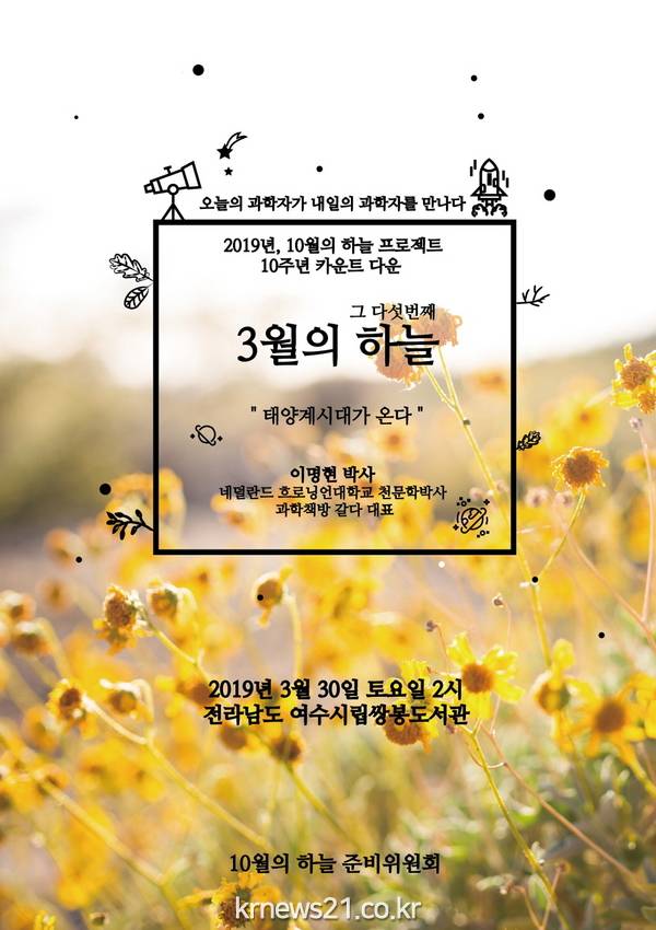 여수시(시장 권오봉)는 30일 오후 2시 쌍봉도서관에서 천문학자 이명현 박사를 초빙해 ‘태양계 시대가 온다’라는 주제로 과학강연회를 개최한다고 밝혔다.