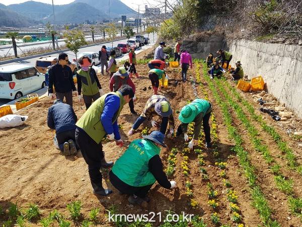 ▲ 지난 14일 여수시 만덕동 통장협의회‧주민자치위원회‧새마을협의회 회원과 동 직원 30여 명이 오천 삼거리 입구 등 꽃밭 10개소(1,717㎡)와 마이카 화분 23개에 팬지와 석죽 등 봄꽃 1만 본을 심었다.