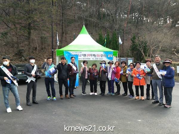 캠페인 참석자는 영취산 진달래체험행사장을 찾은 방문객에게 미세먼지 마스크와 홍보 리플릿을 전달했다.