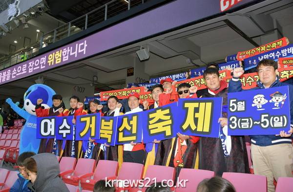 이어 관람석으로 이동해 임진왜란 당시의 승리를 재현하는 퍼포먼스와 낭만여수 밤바다 응원 홍보를 펼친 후 중계석으로 이동해 김성한 해설위원과 함께 1일 명예 해설을 맡아 홍보활동을 이어갔다.
