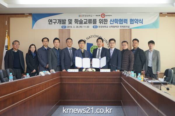 국립한경대학교 총장 임태희는 3월 28일 본교 산학협력관에서 ㈜취영루대표이사 신정호와 연구개발 및 학술교류 활성화를 위한 산학협력 협약을 체결했다.㈜취영루는 자연주의 바이오푸드를 선도하며 다가수 제조공법, 천연바이오 소재 적용 특허기술을 적용하여 제품을 생산하는 70년 전통의 만두 전문기업이다. 4천평의 국내 최대의 단일 만두 생산 공장과 신기술연구소를 보유하고 있으며, 고품질 생산력과 신상품 개발을 통해 소비자에게 안전한 먹거리(무표백, 무방부제, 무향신료, 무첨가물)를 제공하는 기업으로 재성장하고 있다.이번 협약을 통해 한경대학교와 ㈜취영루는 고품질 신제품 등 식품분야의 공동 연구개발과 전문인력 상호교류, 산학협력 연구사업화 등을 수행하게 된다.김용태 한경대학교 산학협력단장은 “간편하고 건강한 식품을 선호하는 소비트렌드가 점차 두드러지게 나타나고 있으며 ㈜취영루와 함께 바이오식품의 기술개발 및 사업화에 노력하겠다”고 밝혔다.