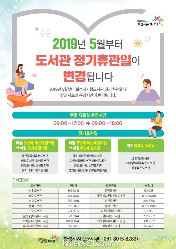 (재)화성시 문화재단(대표이사 최형오) 화성시 시립도서관이 오는 5월부터 민선 7기 공약 사항에 따라 도서관의 정기 휴관 일을 축소 운영한다고 밝혔다.