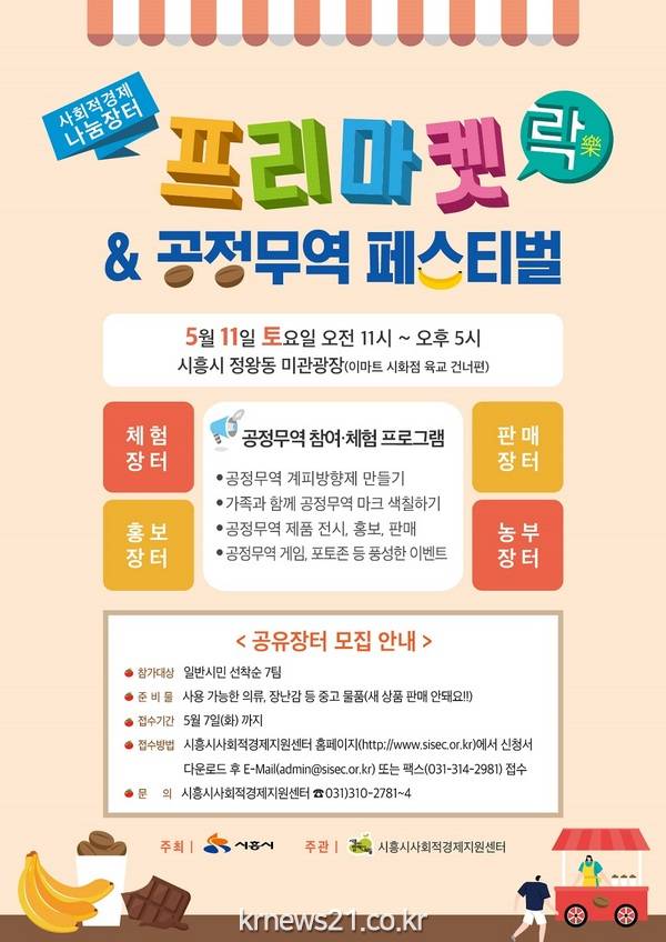 시흥시(시장 임병택)는 다가오는 5월 11일 토요일 11시에 미관광장(이마트 시화점 육교 건너편)에서 『사회적 경제 나눔 장터 프리마켓 락(樂)&공정무역 페스티벌』을 개최한다.