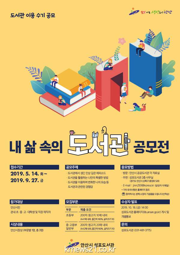 안산시(시장 윤화섭) 성포도서관은 시민들의 다양한 도서관 이용경험 및 독서경험을 공유하고자 ‘도서관 이용 수기 공모전’을 진행한다고 9일 밝혔다.