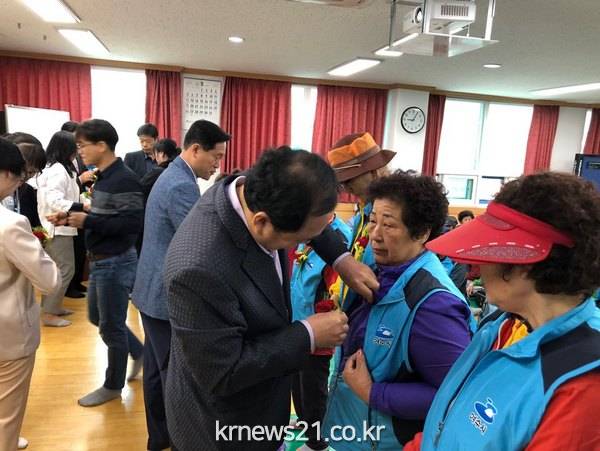 ▲ 지난 8일 여수시 미평동(동장 류갑선)이 어버이날을 맞아 노인일자리 참여 어르신 100여 명에게 카네이션을 달아드렸다.