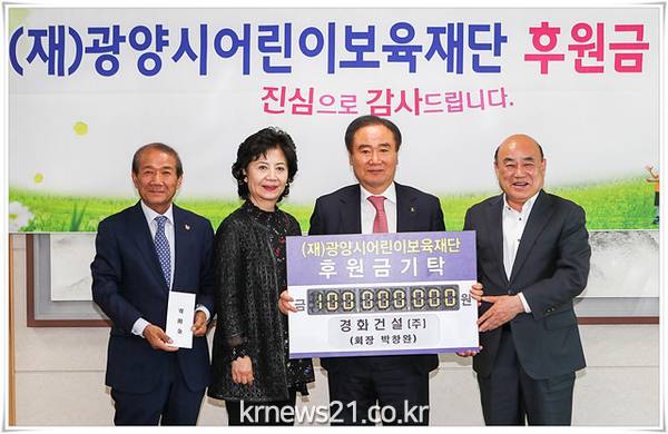 광양시는 경화건설 주식회사(대표 박창완)에서 지난 9일 (재) 광양시어린이보육재단에